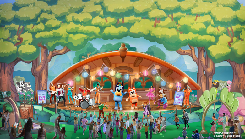 This immersive, family-friendly celebration will transform the Fantasyland Theatre into the grounds of Bluey’s school, where you can join the fun of Bluey’s best day ever. Throughout the day, Bluey and her sister Bingo will appear live on stage, joining a troupe of comedic actors and musicians. Together, they will bring to life the popular music and games emblematic of beloved Bluey episodes, inspiring young families and guests of all ages to participate.